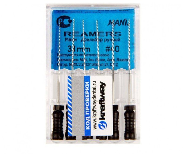 Ример № 40 Mani – ручной эндодонтический инструмент длиной 31 мм, предназначенный для прохождения зубных каналов. Дополнительно расширяет их, помогая подготовить к дальнейшей промывке и пломбированию.